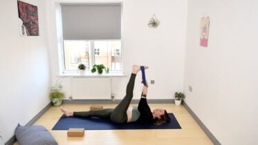 Strenthening mobility, stretchy flow, active deep stretches for the hamstrings, quads and hip flexors. 50mins / pillow, blocks, strap, wall.